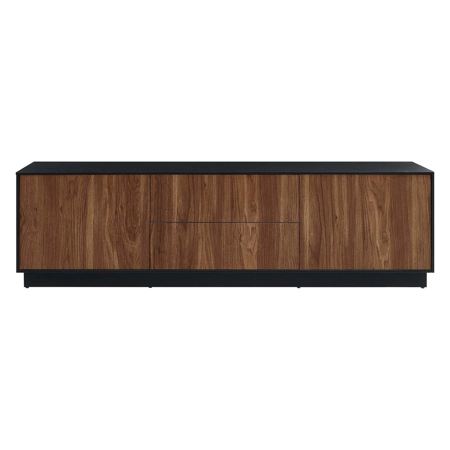 Elevate both style and functionality with the Streamline Walnut Console. Built from MDF and sturdy particleboard, this stand showcases a wood grain laminate on its cabinets and drawers, adding a rustic touch to any modern décor. The Streamline Walnut Console accommodates flat screen TVs up to 70 inches and offers modern conveniences with its push-to-open cabinetry and smartly arranged shelving behind two hinged doors. It features two smooth-glide drawers, dual cable management holes, and rests on a sleek plinth base. Designed for versatility, the Streamline serves as an expansive storage solution for media devices, games, gadgets, and other household essentials. Assembly is required. Weight capacity: 200 lbs.
