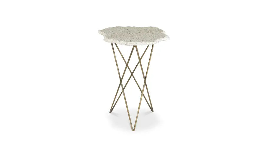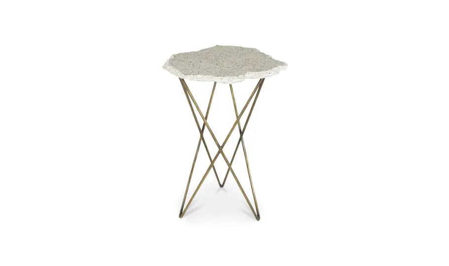 Introducing the Amalfi Side Table, a stunning piece that combines an antique brass-finished bass with a white terrazzo top. This exquisite table not only adds a touch of elegance to your space but also provides the perfect spot to savor your favorite espresso. The white terrazzo table top offers a sleek and captivating design, while the antique-finish iron base adds a vintage charm. Its timeless appeal makes it a versatile addition to any interior style, be it modern, classic, or eclectic. Please note that the beauty of using natural materials is the unique characteristics they possess. Due to the natural variances in marble, each Amalfi Side Table will showcase distinctive tones and vein markings, ensuring that no two tables are entirely alike. Embrace the individuality of your piece and enjoy the authentic beauty it brings to your home. Assembly of the Amalfi Side Table is required, but rest assured, it is a straightforward process that won't require extensive efforts or tools. With minimal assembly required and clear instructions provided, setting up your new table will be a breeze. Indulge in the Amalfi Side Table's captivating design, where sophistication meets practicality. Elevate your space with this exquisite addition that promises to bring style and ambiance to every coffee break.