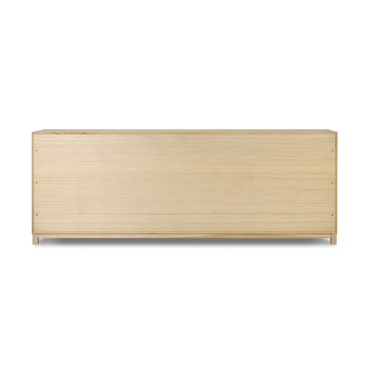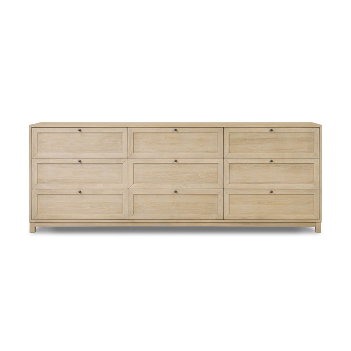 The Chic Oak 9 Drawer Dresser offers a sophisticated storage solution with its light oak veneer finish. Featuring nine spacious drawers, each adorned with smooth fronts and matching knobs, this piece combines practicality with understated elegance. Its clean lines and timeless design make it a versatile addition to any room, providing ample storage space while seamlessly blending with various interior styles.
