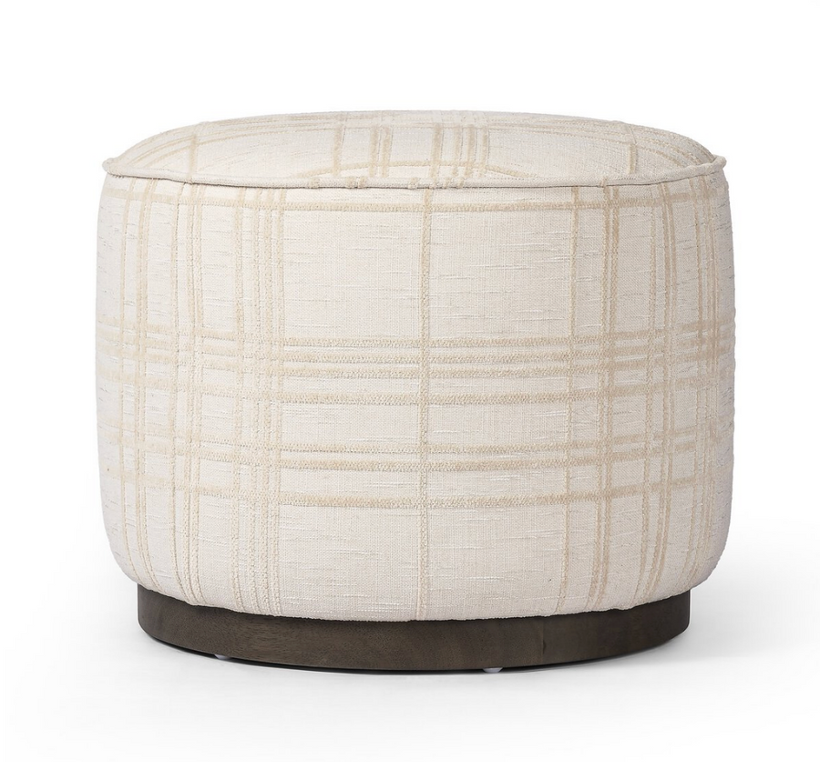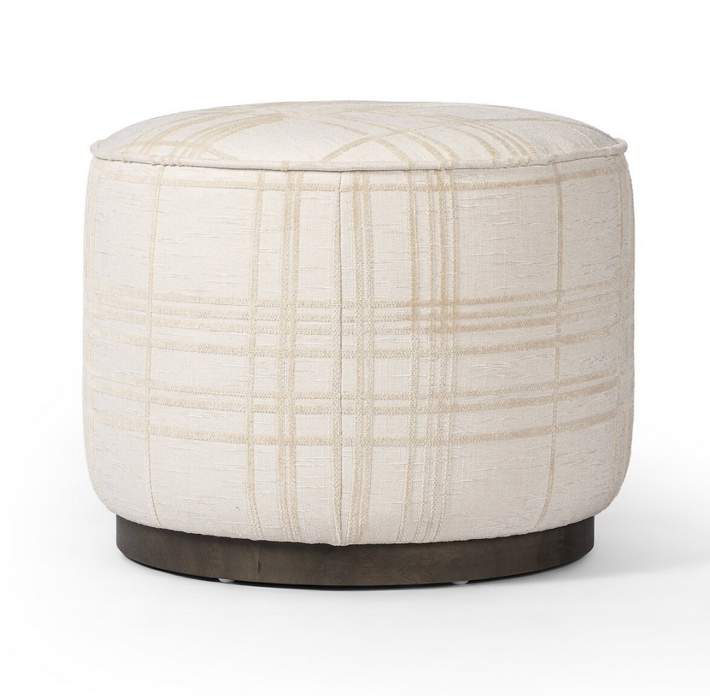 This round ottoman, upholstered in traditional ivory fabric with a classic box print, adds a touch of sophistication wherever it’s placed.