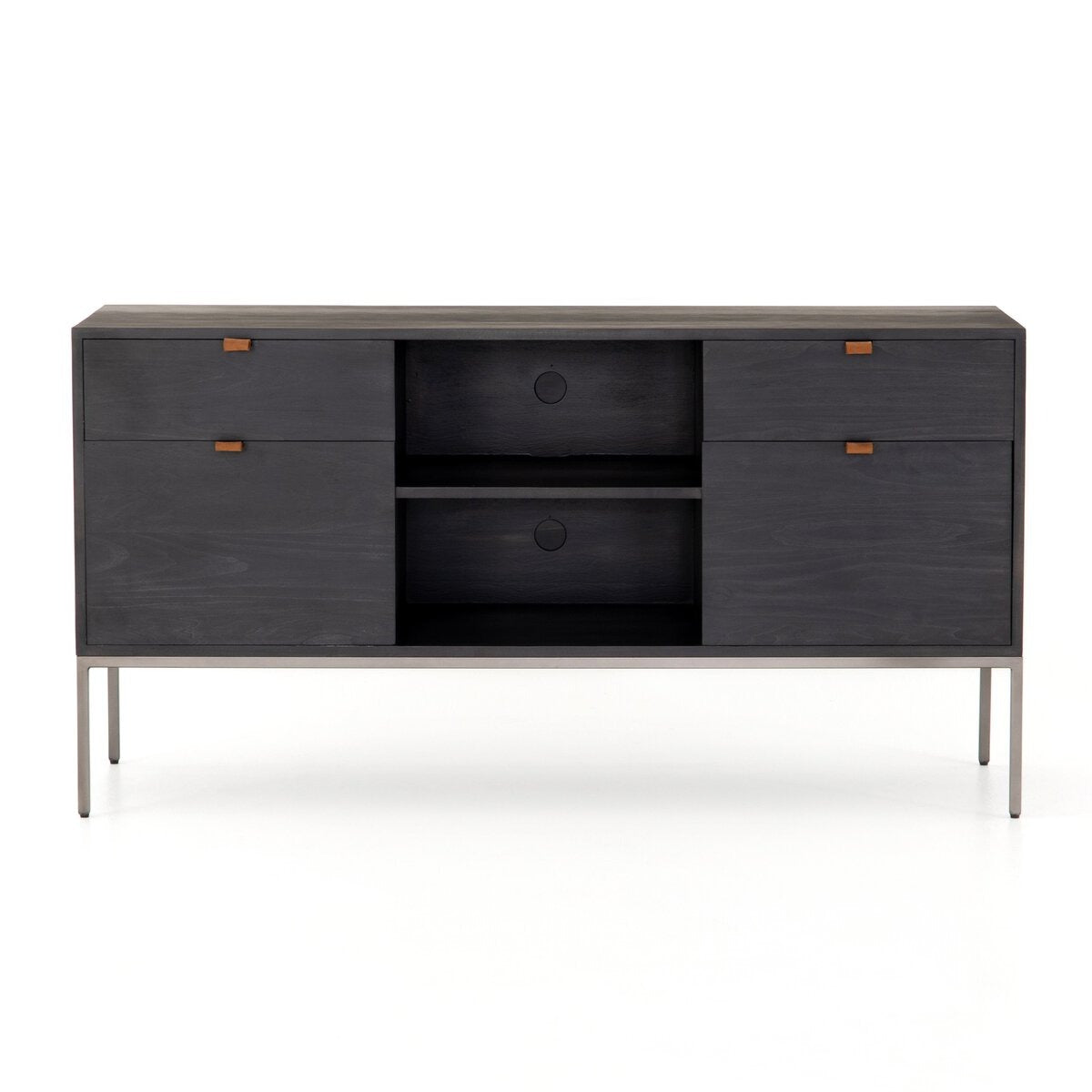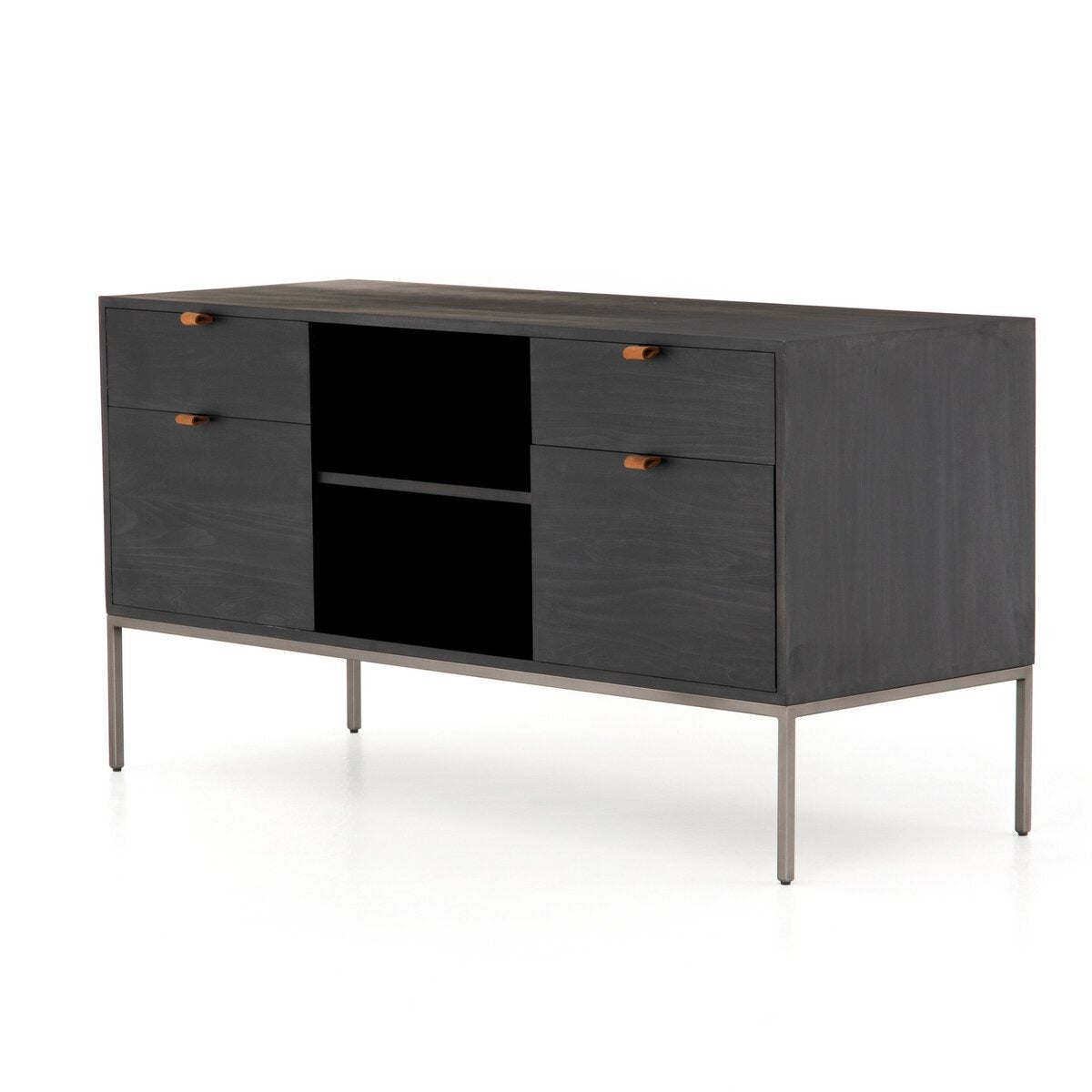Inspired by clean mid-century design, a modular filing credenza of black-finished solid poplar brings roomy storage space to the modern office, with a fully finished back plus metal-secured leather pulls for an element of surprise. Great solo or paired with matching desk or filing cabinet.