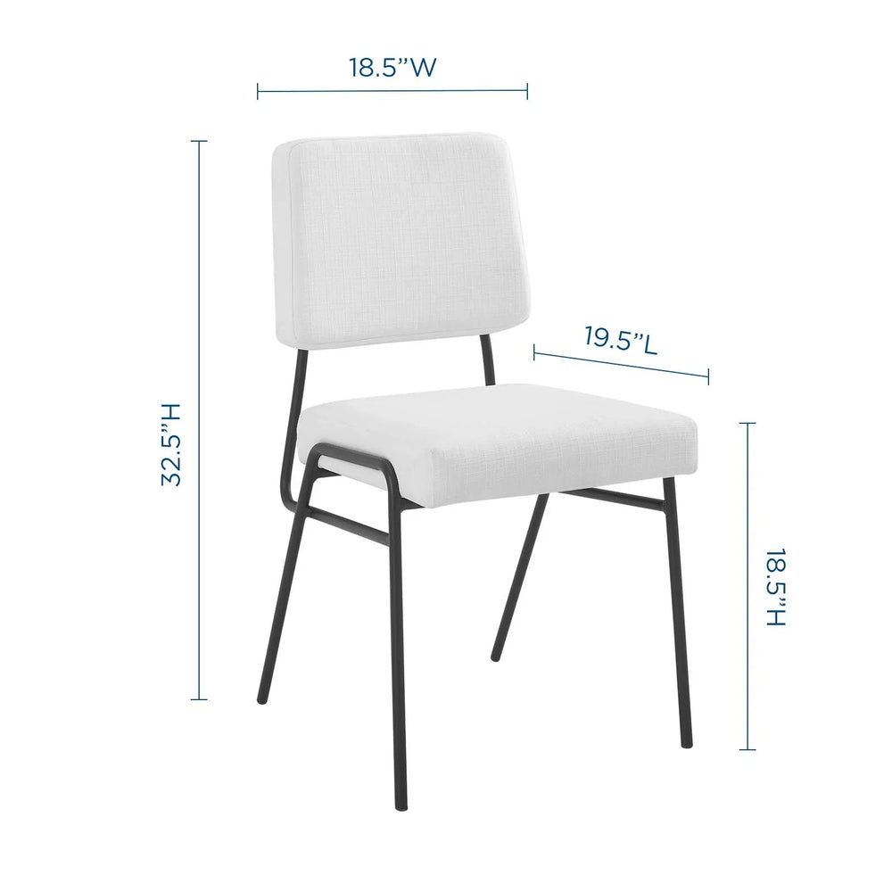 Introducing the Raf Fabric Upholstered Dining Side Chair, a stunning fusion of mid-century modern style and retro glamour. Immerse yourself in the timeless aesthetics of this chair that promises both comfort and elegance. Crafted with utmost care, the Raf Dining Side Chair boasts dual densely padded foam cushions adorned with soft and durable polyester fabric upholstery. You'll indulge in pure luxury as you settle into its plush seating, providing an incredible level of comfort. Breathability is key, and the open design of this chair ensures optimal airflow, keeping you cool and comfortable during long conversations or decadent meals. Make a statement with the Raf Accent Chair, as it sits upon an eye-catching matte black stainless steel frame. Its flared rear legs and non-marking foot caps not only enhance its overall aesthetic appeal but also protect your floor from any potential scratches. Ready to take on any space in style, this chair effortlessly enhances your dining room, lounge room, or office decor. The Raf Fabric Upholstered Dining Side Chair is a remarkable addition that effortlessly elevates the ambiance of any room. We have taken care of the assembly for you, as this chair comes fully assembled. Simply unbox, place it in your desired spot, and enjoy the luxury and comfort it brings. Experience the captivating blend of mid-century modern and retro glamour with the Raf Fabric Upholstered Dining Side Chair. Upgrade your seating and indulge in an extraordinary seating experience today.