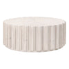 The Roma Coffee Table is crafted from solid reclaimed pine wood, reclaimed pine veneer, and MDF, showcasing the natural character that defines reclaimed materials. Variations in grain, texture, subtle cracks, knots, and color shifts are inherent to the wood and enhance the authenticity of each piece. A new reinforced, stain-resistant treatment adds durability while preserving the table’s organic feel. The round profile is wrapped in decorative wood fluting, giving the surface depth and sculptural presence. Resting on a sturdy plinth base, this design blends rustic warmth with a clean, architectural foundation.