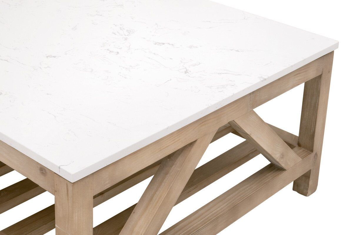 The Spruce Coffee Table brings together the warmth of reclaimed wood and the refinement of solid quartz. Its trestle-style base, crafted from reclaimed pine, carries the natural markings, textured grain, and organic imperfections that define this material’s character. These variations—whether uneven grain, knots, small cracks, or subtle shifts in tone—are inherent to the wood and contribute to its authenticity. Above the base rests a durable solid quartz slab top with a marble-look surface, offering the elegance of stone with dependable strength for everyday use. The combination creates a grounded, timeless piece that balances rustic structure with polished simplicity.