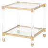 The Nouveau End Table pairs clean geometry with modern materials, creating a piece that feels airy yet substantial. A tempered glass top rests on a sleek metal frame, giving the surface a clear, polished presence. Acrylic round legs add sculptural interest and a subtle glow, balancing the structure with a contemporary edge. A lower storage shelf offers practical space for books, trays, or décor while keeping the silhouette open and uncluttered. Built from steel, acrylic, and tempered glass, this table brings a refined, modern character to any living space without compromising durability or function.