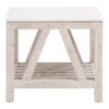 The Spruce End Table blends natural texture with refined durability, pairing a reclaimed pine wood trestle base with a solid quartz slab top. The pine carries its own history—expect shifts in grain, visible knots, markings, and subtle imperfections that highlight the character of reclaimed wood rather than flaws. The marble-look quartz top offers a clean, polished contrast with dependable strength suited for daily use. Its square silhouette keeps the design crisp and versatile, making it an easy fit beside a sofa, armchair, or bed while adding a grounded, timeless presence to the room.