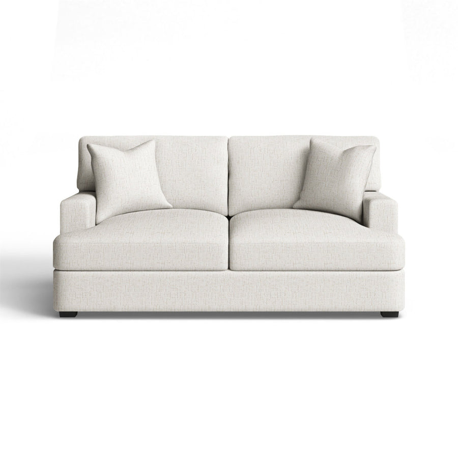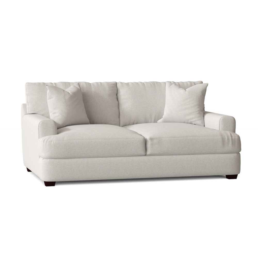 Relax in comfort with this plush loveseat. This design features T-shaped seat cushions that will stay firmly in place while you lounge. The seat cushions are filled with foam, which makes for an especially comfortable seat. The arms frame the piece and add to the relaxed vibe. A low front rail gives the piece a low-profile silhouette, while finished wood legs round it out in style. Wayfair Custom Upholstery™ Fabric: Indy Cream Performance