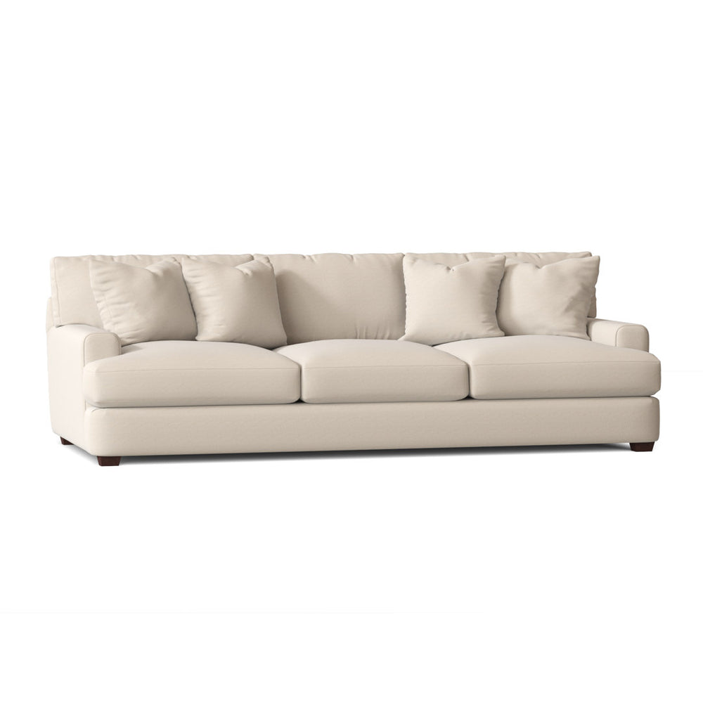 A low-profile silhouette along with a wide, spacious frame makes this sofa the ideal spot to hang out for movie night. It's made from solid and engineered wood, and it rests on black walnut-hued block feet. Upholstered in the fabric and hue of your choice, this sofa easily matches your room's current style and color scheme. Foam-filled seats also feature sinuous springs to give you ample support. Plus, its seat and back cushions and covers are removable, so it's a cinch to clean. Four toss pillows are included for added layering. Wayfair Custom Upholstery™ Fabric: Bayou Natural Washable Canvas
