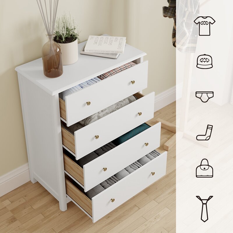 clean-lined 4 drawer chest brings storage and delicate & elegant charm to your master suite or guest room. Large drawers with metal handles offer plenty of space for soring shirts, socks, sweaters, tie, and jeans, while the chest's top surface provides a perfect platform for framed photos or a stylish lamp. Features: MULTIFUNCTION Great for bedroom, closet, nursery, laundry, playroom, bathroom, entryway and more Large Drawer The spacious drawer can classify storage for sportswear, skirt, underwear, toy, file, and other stuff Premium Slid Rail High-quality metal sliding rail, durable for long time use Perfect Gift This Winston Porter drawer chest is a perfect housewarming present and also is great as a gift for your family at different festival Specification: - Color: White Color - Material: High-quality Wood and MDF - Size: 29?L x 15.7?W x 37?H - Drawer Size: 24.6?Lx13.8?Wx5.5?H Package Contents: - 1 x White Cabinet - 4 x Drawers - 1 x Instructions - 1 x Tools Bag Winston Porter Note: - Please install the anti-toppling device for the white chest on the wall for safety. - Please avoid sharp objects to scratch on the surface.