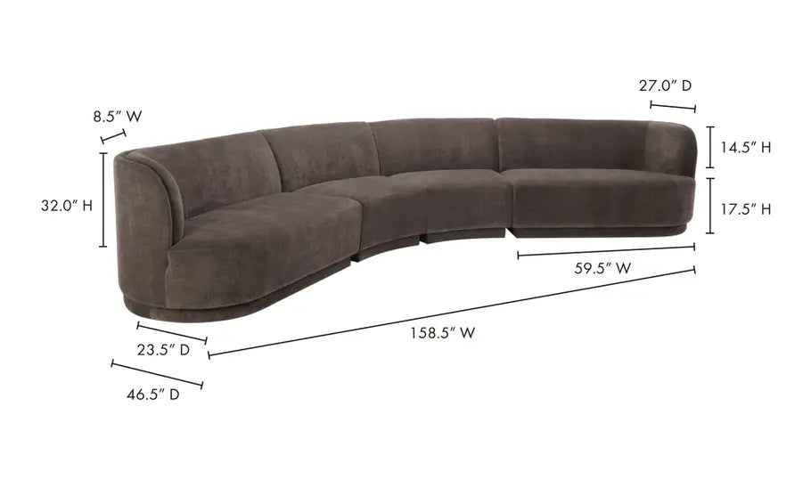 Introducing the Yun Eclipse Modular Sofa, your ultimate haven for pure relaxation. This enchanting 4-part sectional sofa boasts a left-facing chaise, exquisitely crafted grey upholstery, and graceful, curving lines that epitomize elegance in mid-century modern design. Crafted with the utmost care, the Yun Eclipse Sofa features a frame constructed from sustainably sourced FSC certified pine and plywood. This not only ensures the durability and longevity of the sofa but also makes it an environmentally conscious choice. Drift into a state of tranquility as you sink into the soft cream white upholstery of this heavenly sectional sofa. Designed for utmost comfort, the cushions boast foam and fiber fill with reliable webbing and coil spring support, providing you with a plush seating experience like no other. One of the highlights of the Yun Eclipse Sofa is its modular design. Each sectional item comes equipped with easy attach sectional connectors, effortlessly joining the components together. No more hassle of complicated assembly procedures; it's simplicity and convenience at its finest.