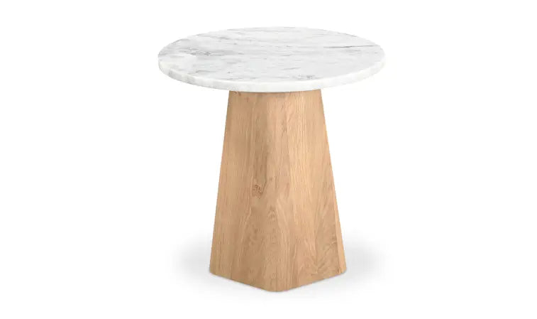 The Evie accent table is a harmonious contrast of materiality and tactility, where a weighty base meets a visually light marble top. With five connected sides equipped with softened, rounded edges, the base assumes an organic appearance, its natural color subtly softening the marble top for enduring visual appeal.