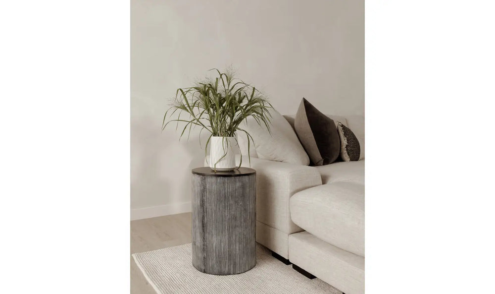 Introducing the Lydia End Table, designed to bring a touch of whimsy to your decor with its minimalist cylindrical design and sleek black striped finish. This distinctive piece effortlessly combines style and functionality, making it a must-have addition to any space. Crafted with a striking and sturdy aluminum base, this end table guarantees durability without compromising on aesthetics. Its black table top finish adds a sleek and modern touch, creating a seamless blend of industrial elegance. One of the best features of the Lydia End Table is its hassle-free setup. With no assembly required, you can enjoy this unique piece right out of the box. Simply find the perfect spot in your home and let it effortlessly enhance your space. Embracing an industrial style, this end table serves as a conversation starter in any room. Its minimalist yet eye-catching design is an expression of creativity, ideal for those who appreciate thoughtful and unique pieces. Elevate your interior with the Lydia End Table, where modern design meets functional simplicity. Shop now and add this conversation piece to your space!