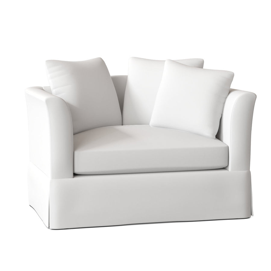 A touch of flare and ultimate comfort, with more than enough room to cuddle cozily, make this slip-covered Chair and a Half a uniquely designed masterpiece for your home. A scalloped, crescent-shaped top rail is accentuated with scatter back pillows and a contrast toss pillow. A luxurious down-blend seat cushion utilizing a core of polyurethane foam encased in a mix of down and fiber will envelop you in pure comfort while you relax or entertain in modern farmhouse style. Accent pillow is included and can be contrasted to add a personal touch illustrating your own unique fashion. Highland Dunes Body Fabric: Peyton Pearl, Throw Pillow Fabric: Bocci Spring