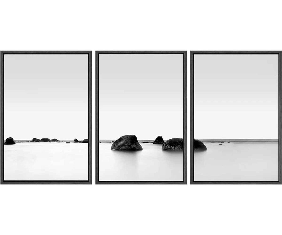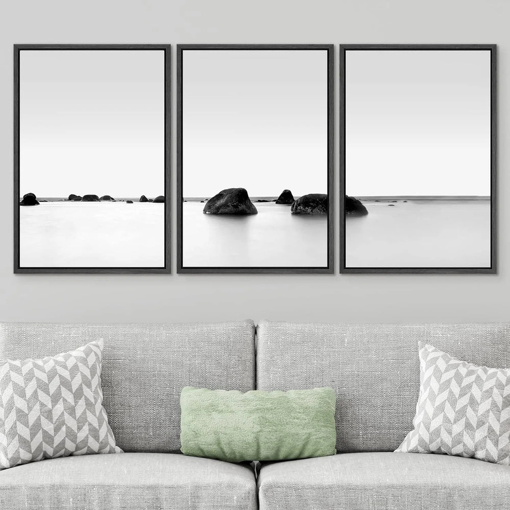 Framed Canvas Print Wall Art Set Black and White Rocky Lake Zen Seascape 3