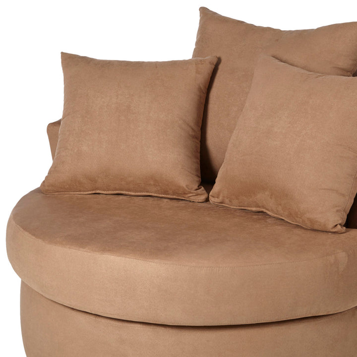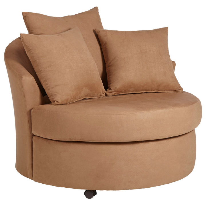 This barrel chair brings a round and inviting silhouette to your living space. Made in the USA with a wood frame, it rests on low-profile feet with a black finish. Boasting a classic barrel shape, it features a rounded back that curves around its sides to act as arms. This chair is upholstered in the fabric type and hue of your choice, blending in seamlessly with your surrounding design scheme. It features removable cushions for easy cleaning, and it comes with three included toss pillows for a curated look. Andover Mills™ Fabric: Dots Laguna