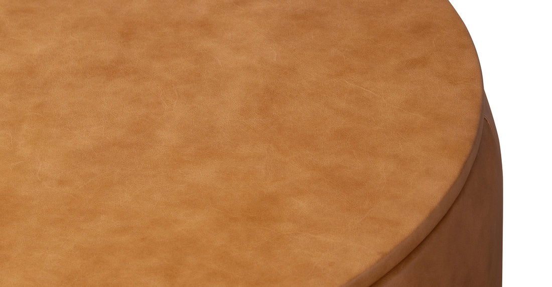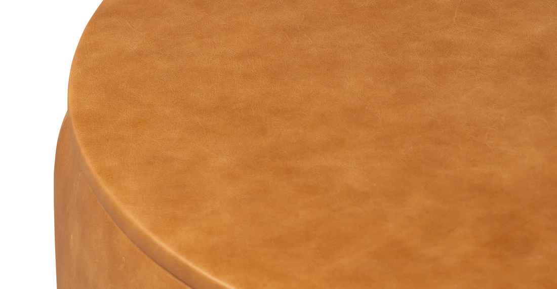 Meet the Herve Ottoman – a dual-role superstar that moonlights as art and storage magician! Lift its leather hat to uncover a secret stash for blankets, pillows, and sneaky clutter. It's like style and smarts joined hands for a living space party! With a round and roly-poly silhouette, it's perched on a wood base, toasted in warm walnut. Wrapped in premium Italian leather, each ottoman is a textural tale of whimsy and color capers! Italian tanned full-grain pure-aniline dyed leather upholstery Cognac tan and olivine green color feature a non-pigmented leather, accentuating the natural beauty of the hide. The leather will scuff and develop into a beautiful vintage patina with use Each hide is unique and will vary in depth of color Kiln-dried solid wood frame Solid wood base in a walnut stain with non-scratch foot caps Arrives fully assembled